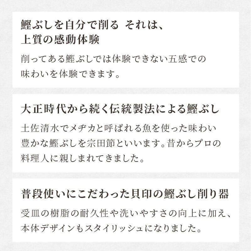 材質 カンナ/刃部:刃物鋼、台:天然木 樹脂部/カバー:ポリプロピレン(耐熱温度80度) 受け皿:AS樹脂(耐熱温度90度) セット内容 000DH7362KHS 鰹ぶし削り器(カバー付) / 1点 S-006-SB-001宗田節 (250g前後×3袋) サイズ詳細 鰹ぶし削り器 本体サイズ:全長/267×58×72mm、重量:419g 宗田節/250g×3袋 生産国 日本貝印がお届けする特別な体験 削って味わう鰹ぶし 「日本に生まれて良かった」をあなたに。