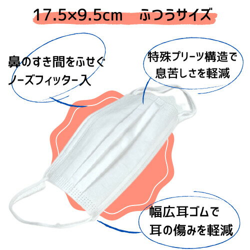 商品情報商品仕様・高密度3層構造タイプ・鼻のすき間をふせぐノーズフィッター入・特殊プリーツ構造で、喋りにくさ息苦しさを軽減・幅広耳ゴムで耳の傷みを軽減サイズ17.5×9.5mm入り数30枚入素材ポリプロピレン不織布、ポリエチレン(ノーズワイヤー)、ポリウレタンゴム(耳紐)ご注意・マスク単品でのご購入はキャンセルとさせていただきます・商品到着後に「ショップレビュー」「商品レビュー」にて、お客様のお声をお聞かせください・同時購入品が【送料無料】商品の場合でも、ご購入合計金額が3,980円未満の場合は追加送料が発生します(ご注文確認後にメールにてご連絡)・同時購入品がメール便商品の場合、宅配便に変更させていただきます\なんと100円!/不織布マスク ふつうサイズ 30枚入り 楽天出店1周年記念特別価格! ワンコインでマスクを購入してレビューを書こう! ※本商品のみの購入不可 ■楽天出店1周年記念の特別価格!■商品到着後に、ショップレビューと商品レビューをご記入ください■ご注文合計3,980円以下の場合は注意事項をご確認ください 使い捨てマスク つかいすてマスク 普通サイズ 男女共用 ノーズフィッター ノーズワイヤー プリーツ加工 花粉対策 風邪対策 飛沫対策 2