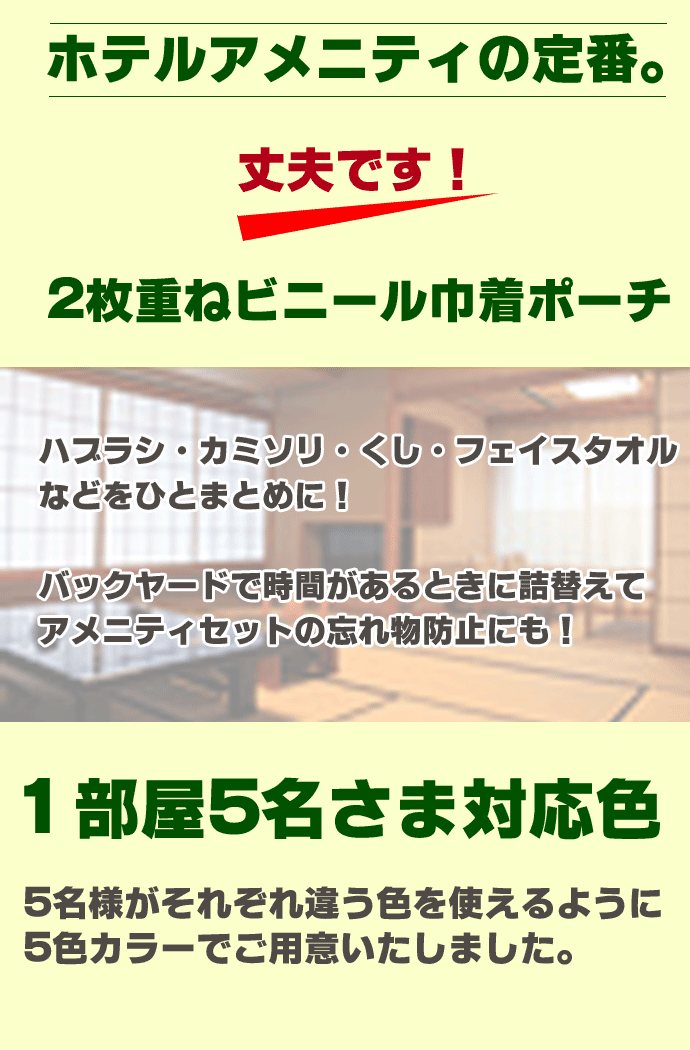 エステ・ホテル・旅館の定番 ビニール巾着ポーチLサイズ巾着ポーチ一覧はこちら業務用アメニティ一覧はこちらからどうぞPOLAの業務用アメニティ激安!業務用シャンプー増量キャンペーン中!ノンシリコンシャンプー