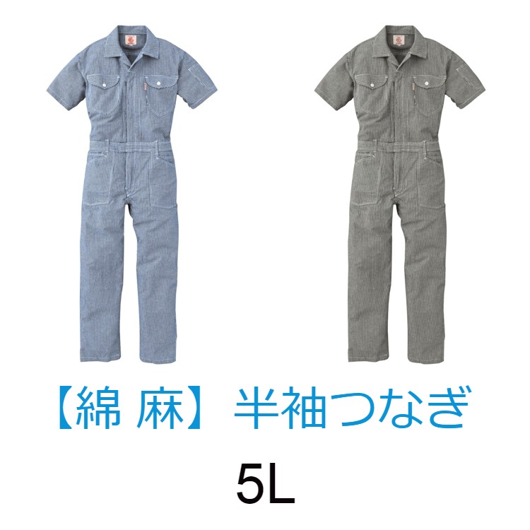 半袖つなぎ 作業服 メンズ 【 春夏物 】 送料無料 綿×麻 ヒッコリー 半袖ツナギ 大きいサイズ 5L GE-925 ビッグサイズ